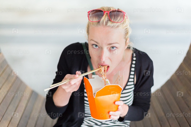 Женщина ест китайскую лапшу