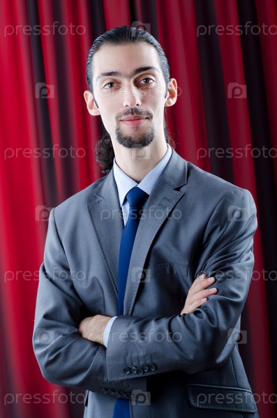 Молодой предприниматель на фоне занавеса