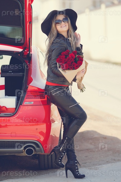 Красивая женщина с букетом красных роз