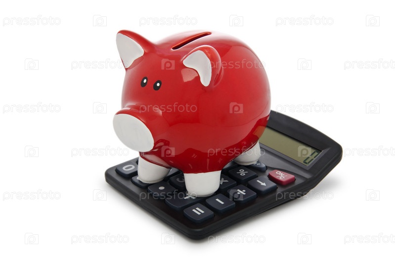 Калькулятор и копилка на белом фоне