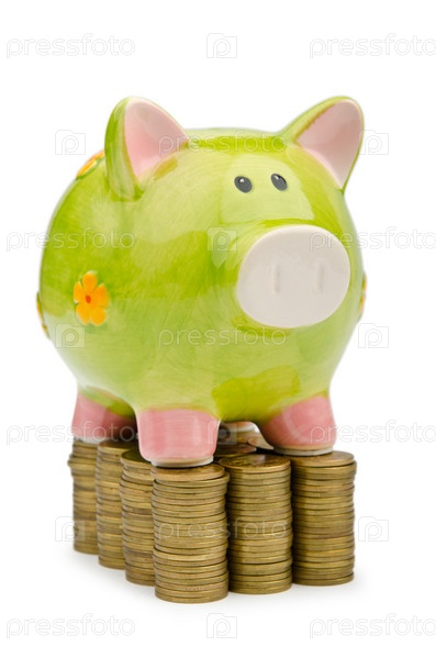 Копилка и монеты на белом фоне