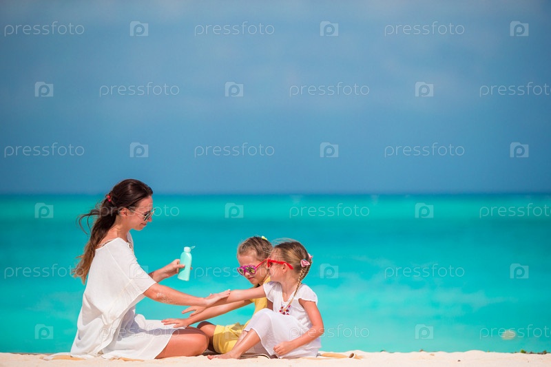Молодая мать с дочерьми на пляже