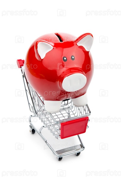 Копилка и корзина для покупок на белом фоне