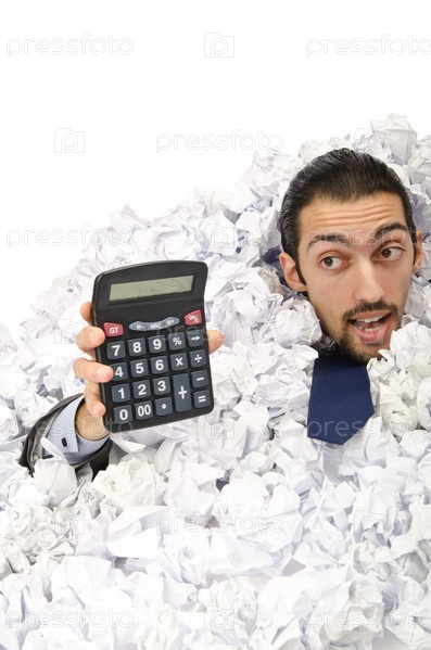 Человек в бумажных обрезках с калькулятором в руках