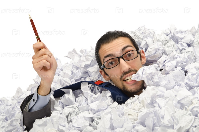 Молодой бизнесмен с ручкой на фоне большого количества макулатуры