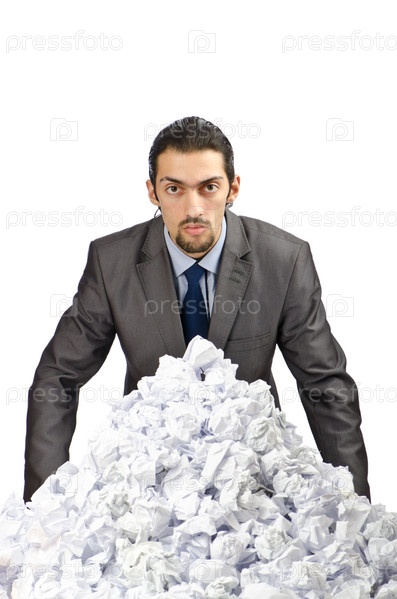 Бизнесмен с большой кучей мятой бумаги