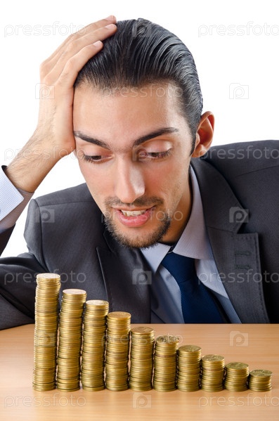 Бизнесмен смотрит на стопки монет