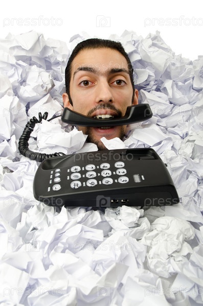 Мужчина с телефоном в куче скомканной бумаги