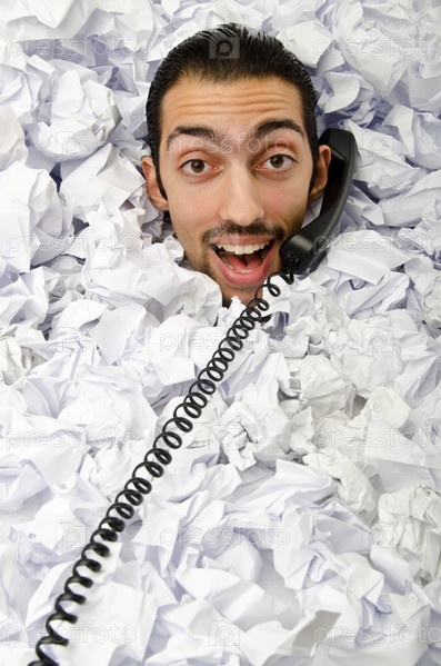 Мужчина с телефоном в куче скомканной бумаги
