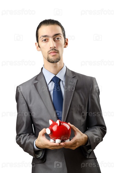 Бизнесмен и копилка на белом фоне