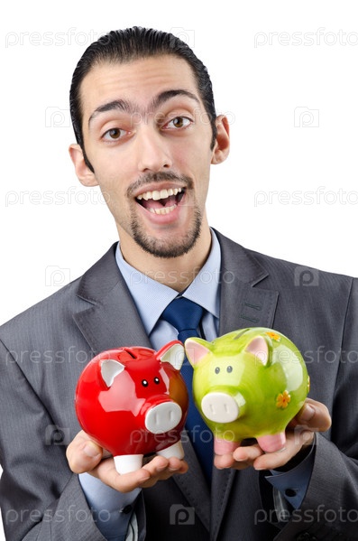 Бизнесмен и копилки на белом фоне