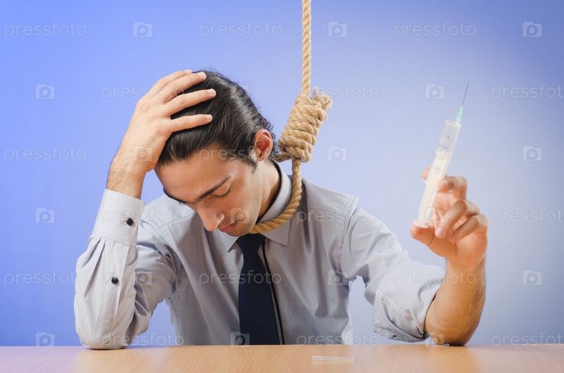 Бизнесмен с веревкой на шее со шприцем в руках