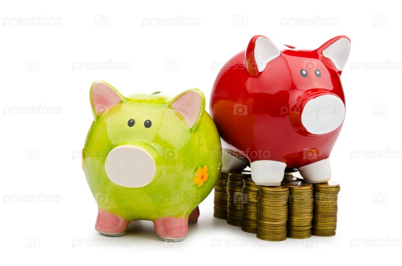 Копилки и монеты, изолировано на белом фоне