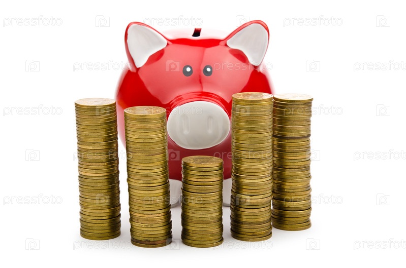 Копилка и монеты на белом фоне