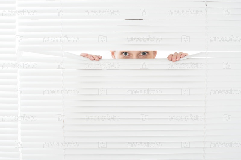 Девушка подглядывает через жалюзи