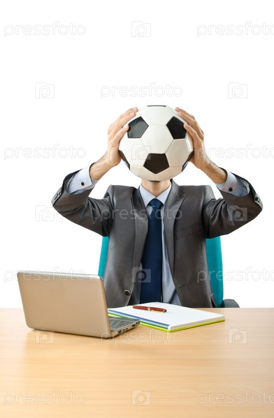 Бизнесмен с футбольным мячом на белом фоне
