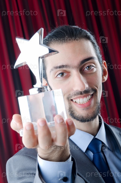 Улыбающийся молодой человек держит награду в форме звезды на фоне красного занавеса