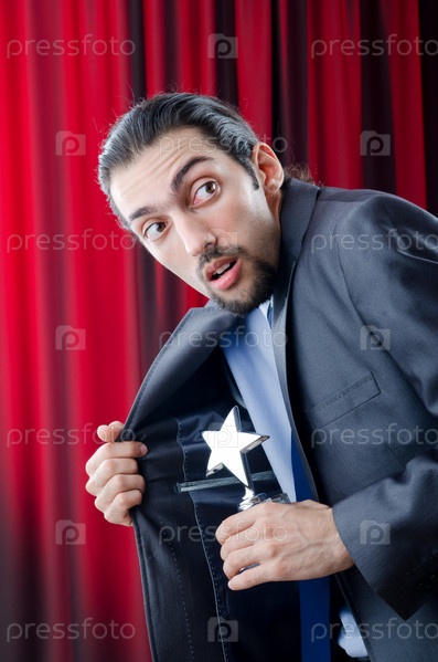 Молодой бизнесмен прячет награду в форме звезды на фоне красного занавеса