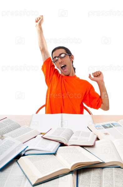 Уставший студент в оранжевой рубашке зевает за столом с учебниками, белый фон