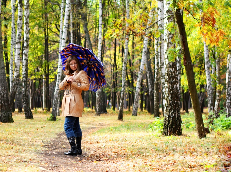 Молодая женщина в осеннем лесу с зонтом