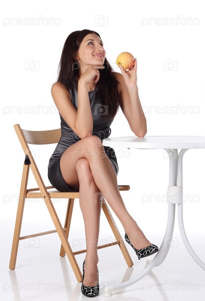 Красивая девушка с яблоком за столом