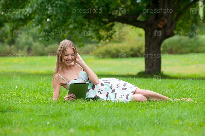 Красивая девушка лежит на траве с планшетным компьютером