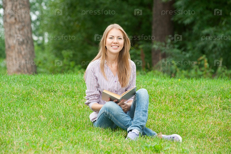 Молодая женщина сидит на траве с открытой книгой