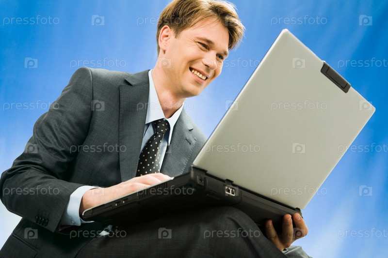 Успешный молодой улыбающийся бизнесмен видит план решение вопроса в ноутбуке