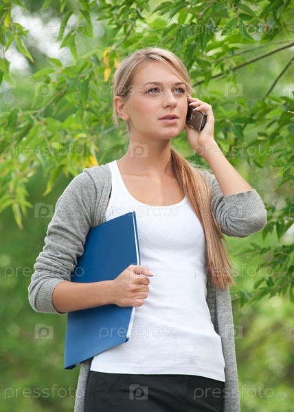 Бизнес-леди говорит по телефону на открытом воздухе