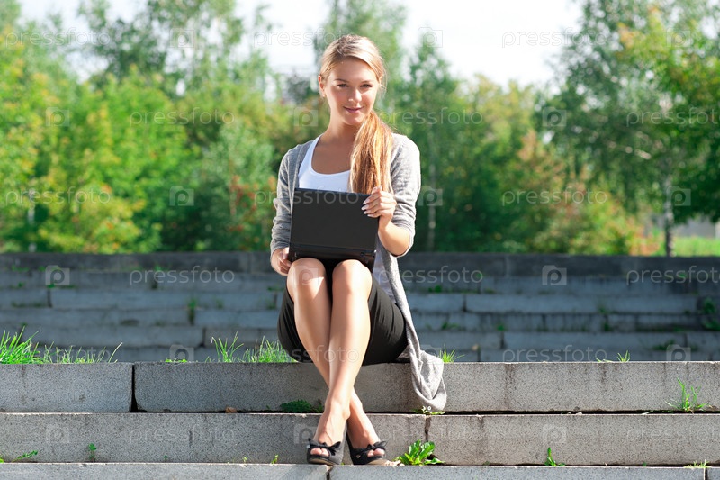 Деловая женщина сидит на тротуаре с ноутбуком и говорит по сотовому телефону