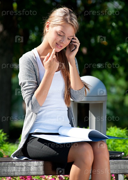 Деловая женщина сидит на скамейке в парке и говорит по телефону