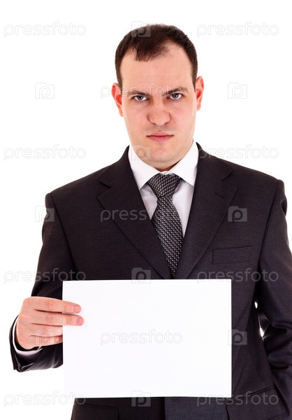 Разгневанный бизнесмен показывает бумагу, белый фон