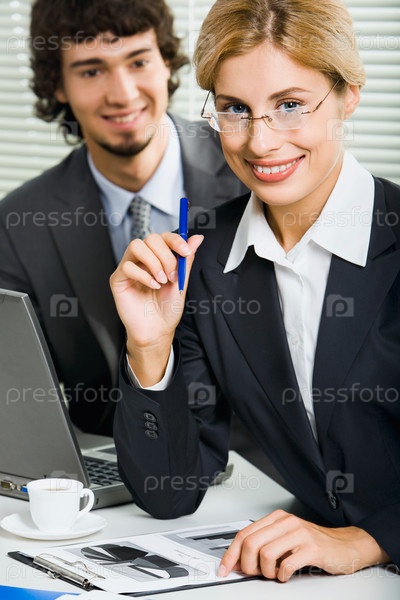 Успешная молодая бизнес-женщина держит голубую ручку и сидит за столом