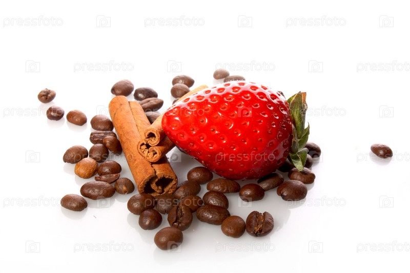 Ягода клубники с кофейными зернами и палочками корицы на белом фоне