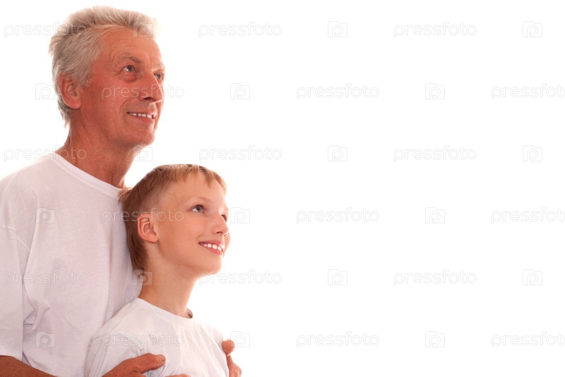 Дедушка с внуком на белом фоне
