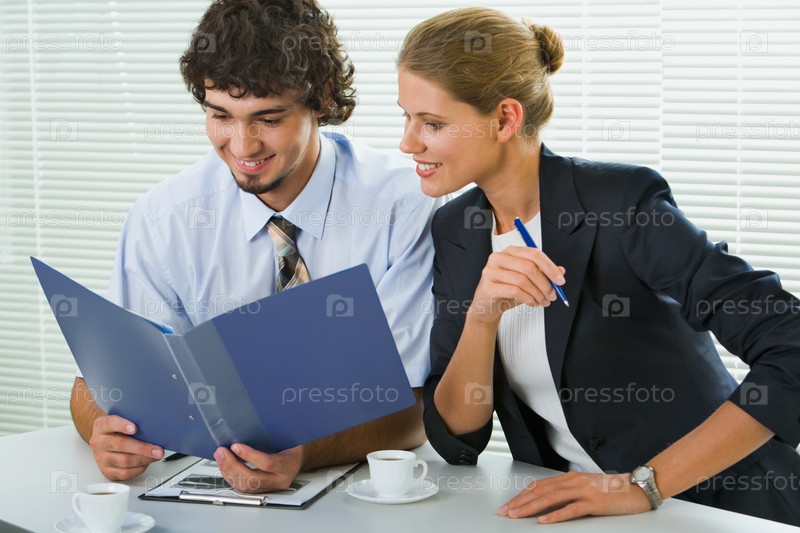 Портрет бизнесменов, сидящих за столом и читающих бумаги