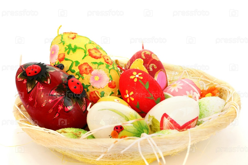 Пасхальные свечи в корзине на белом фоне