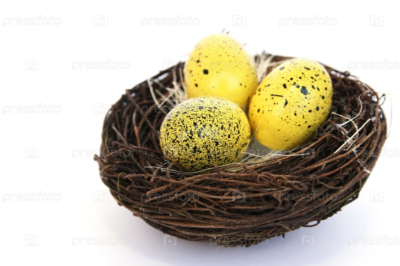 Пасхальные яйца в гнезде на белом фоне