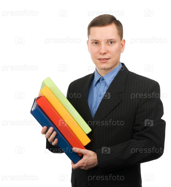 Бизнесмен с цветными папками, изолированные на белом
