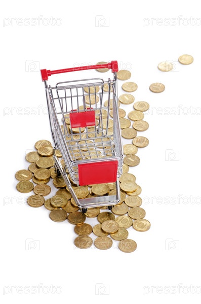 Продуктовая тележка и монеты, изолированные на белом фоне