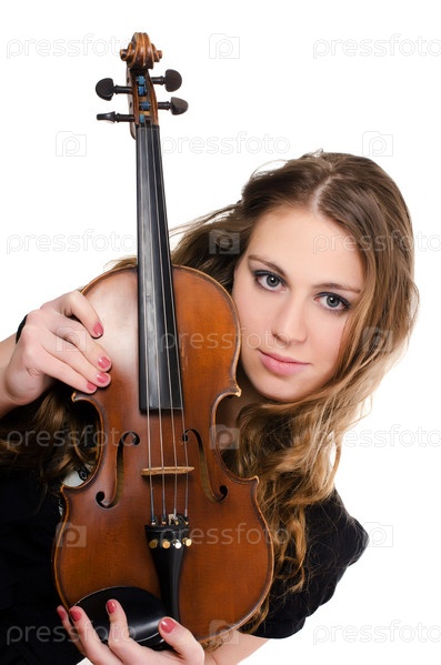 Красивая девушка со скрипкой, изолированная на белом фоне