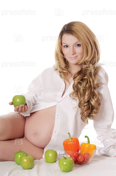 Молодая красивая беременная женщина с овощами и фруктами на белом фоне