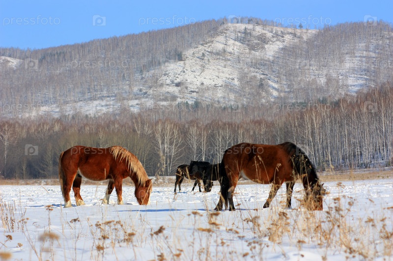 Лошади пасутся на снежном поле