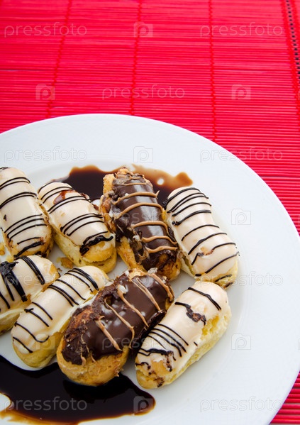 Сладкое пирожное с шоколадным сиропом на тарелке