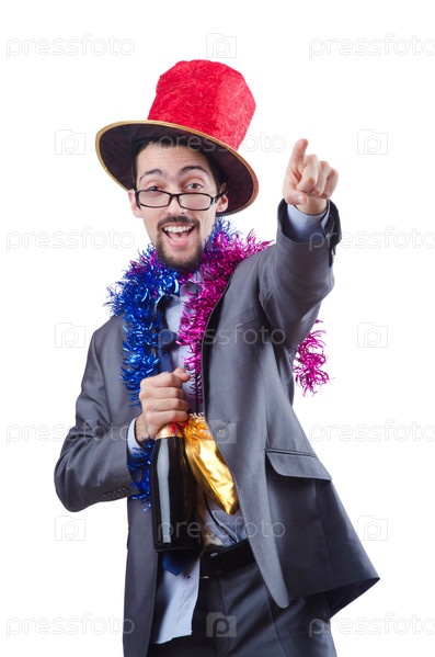 Мужчина с шампанским на белом фоне. Концепция праздника