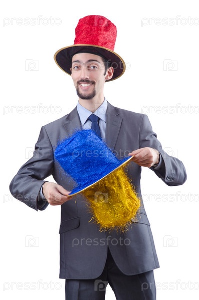 Мужчина со шляпами на белом фоне. Концепция праздника