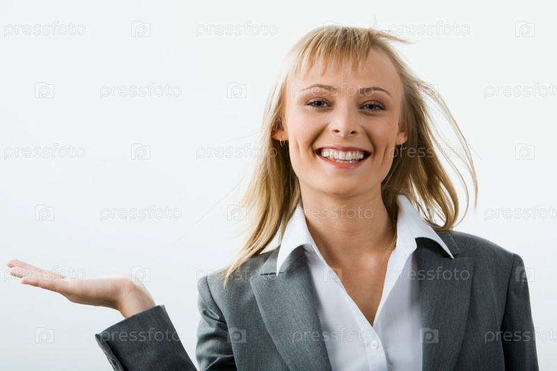 Молодая стильная деловая женщина, удерживающая элегантно ее руку на белом фоне