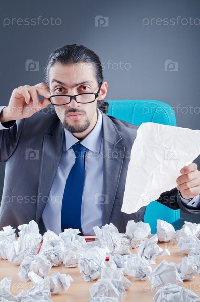Предприниматель с большим количеством скомканных листов бумаги