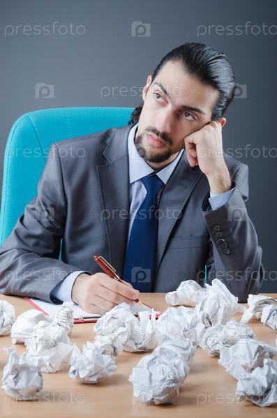 Предприниматель с кучей скомканной бумаги сидит за столом