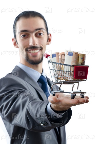 Бизнесмен с корзиной полной денег